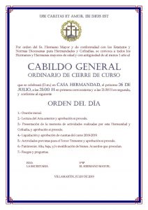 De igual manera, la Hermandad del Santo Entierro, tiene convocado su Cabildo de cierre de curso para el próximo 26 de julio.