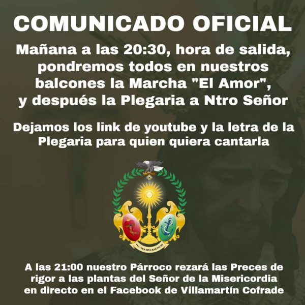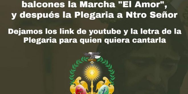 Igualmente la hermandad ha convocado a todos y todas, a que a partir de las 20:30 horas, pongan en sus balcones la marcha «El Amor», para a continuación cantar la plegaria que todos los años canta María Onate, cuya letra es de Isaac Fuentes.